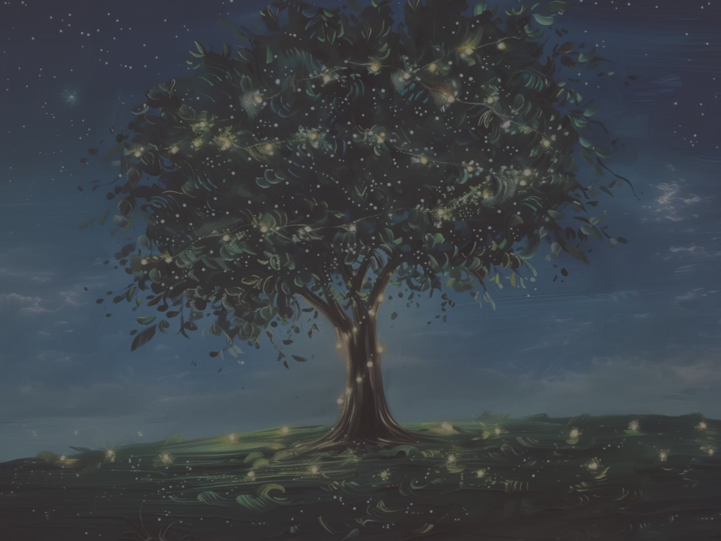 Verleihen Sie Ihrem Zuhause mit diesem leuchtenden Glühwürmchen-Baum-Kissen einen Hauch von Magie und Ruhe. Das Motiv zeigt eine zauberhafte Sternenlandschaft: Ein leuchtender Baum, umhüllt von sanftem Goldlicht, schwebt unter einem tiefblauen Sternenhimmel und ist von Glühwürmchen umgeben.