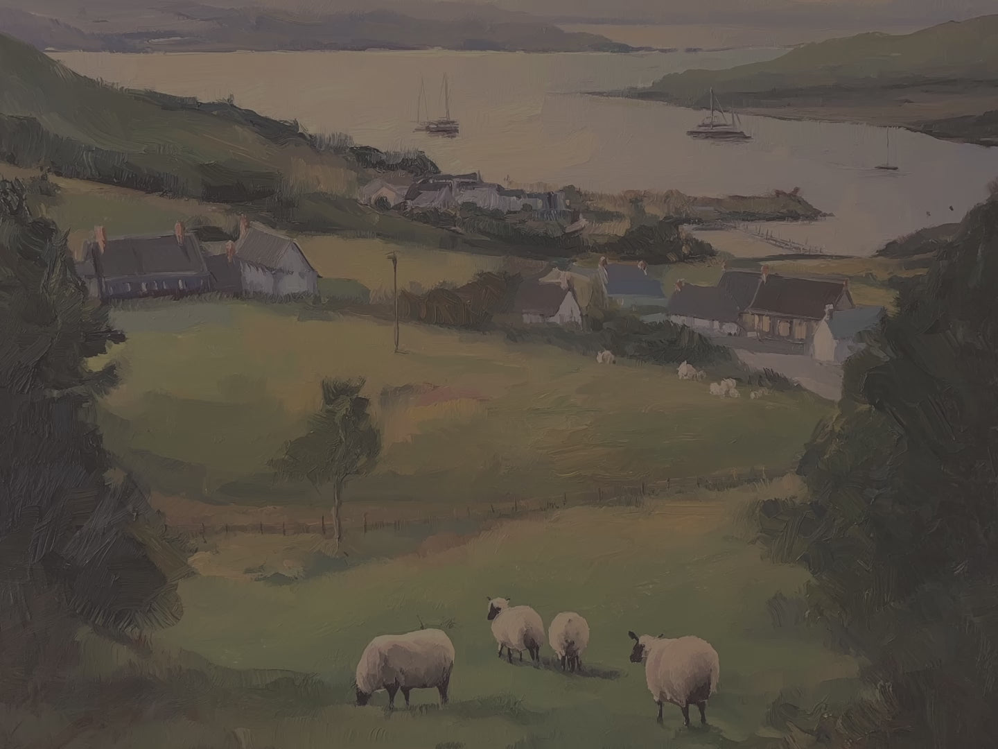 Halten Sie Ihre Gedanken in diesem Hardcover-Notizbuch mit irischem Landschaftsmotiv fest. Eine idyllische Wiesenlandschaft mit friedlich grasenden Küstenschafen am ruhigen Wasser, umrahmt von sanften grünen Hügeln und dem Blick auf den Hafen, schafft eine malerische Kulisse, die die zeitlose Schönheit der irischen Landschaft widerspiegelt.