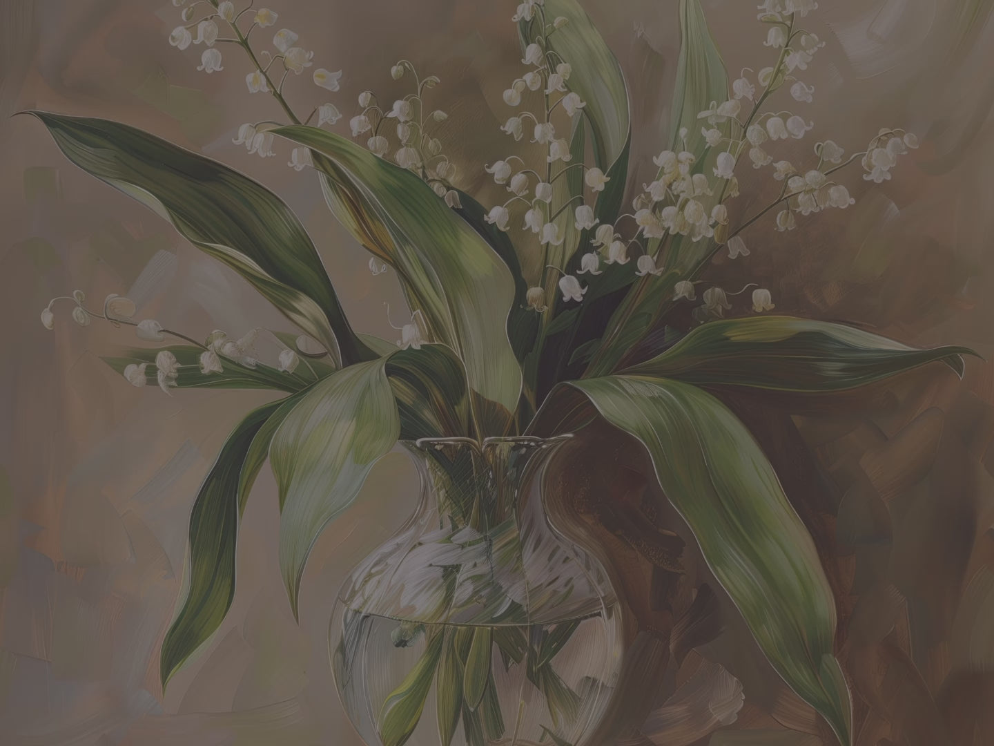 Halten Sie Ihre Gedanken in diesem Notizbuch mit Maiglöckchenmotiv fest. Ein ruhiges Blumenstillleben zeigt zarte weiße Glockenblüten und fließende grüne Blätter in einer klaren Glasvase vor einem warmen, neutralen Hintergrund – eine elegante und beruhigende botanische Komposition.
