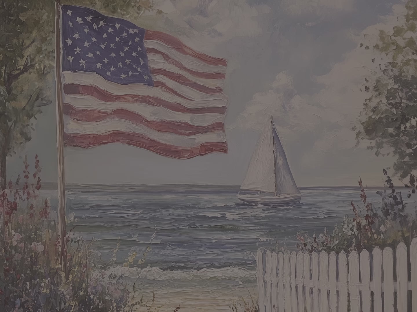 This beautiful blanket combines American pride with coastal living, showcasing a charming beach path adorned with vibrant flowers leading to the ocean. The waving flag, classic white picket fence, and sailboat on the horizon create an idyllic seaside scene that's perfect for beach houses, coastal cottages, or anyone who loves nautical Americana and summer by the sea.