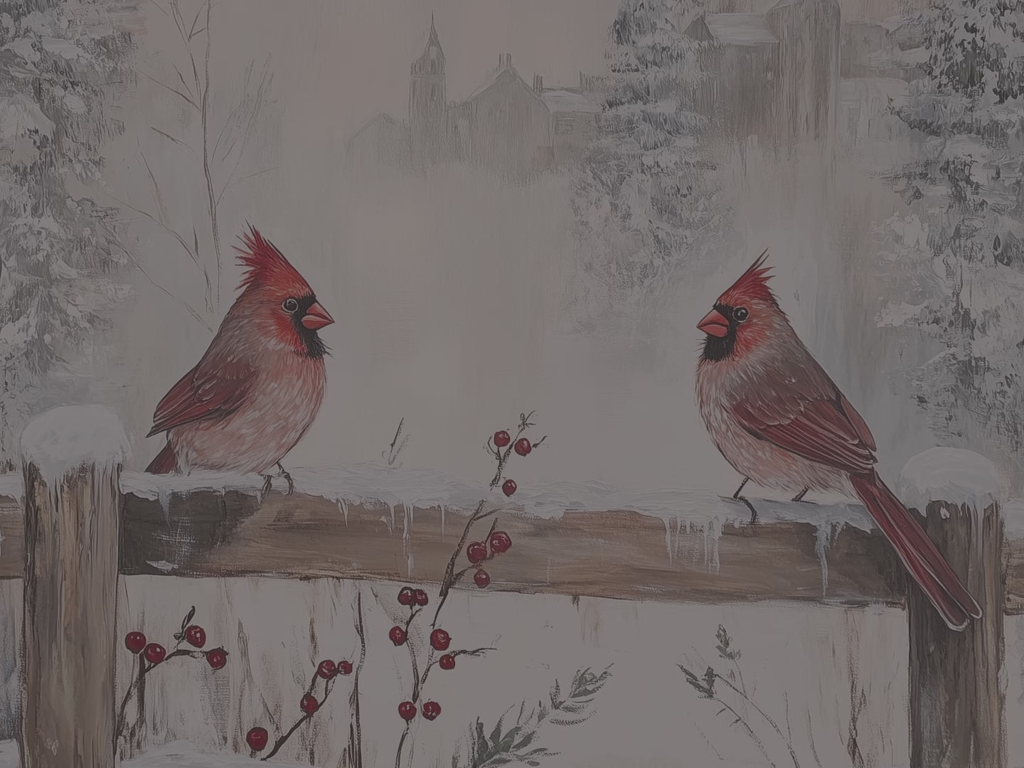 Halten Sie Ihre Gedanken in diesem Hardcover-Notizbuch mit Winterkardinalen fest. Zwei leuchtend rote Kardinäle sitzen auf einem rustikalen, schneebedeckten Zaun, umgeben von frostigen immergrünen Zweigen, sanft fallendem Schnee und roten Winterbeeren – eine friedvolle Szene, die die idyllische Stimmung einer ländlichen Winterlandschaft widerspiegelt.