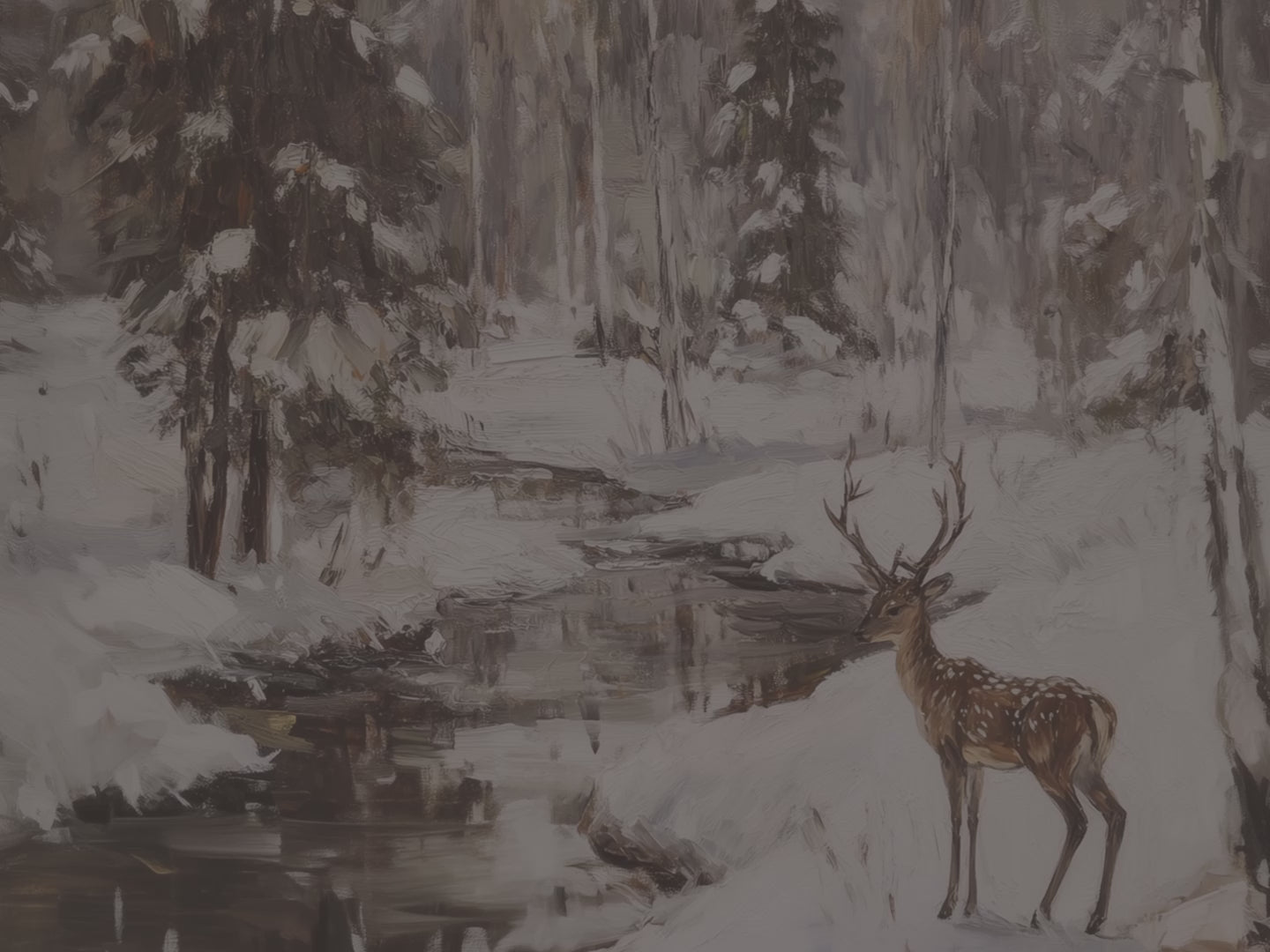 Holen Sie sich die friedvolle Schönheit des Winters in Ihr Zuhause mit diesem bezaubernden Leinwandbild mit Hirschmotiv. Ein anmutiger Hirsch steht an einem stillen, spiegelglatten Bach, umgeben von hoch aufragenden, schneebedeckten Nadelbäumen und sanftem Schneetreiben. So entsteht eine idyllische Waldszene, die den stillen Zauber des Winterwaldes einfängt.